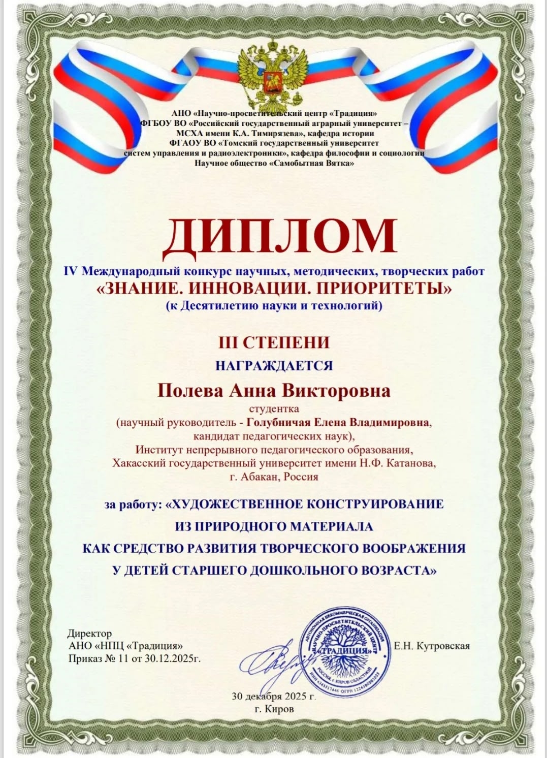 Еще одна научно-исследовательская работа «Художественное конструирование из природного материала как средство развития творческого воображения у детей старшего дошкольного возраста» стала бронзовым призёром конкурса. Её автор – Анна Полева (научный руководитель – кандидат педагогических наук Елена Голубничая).