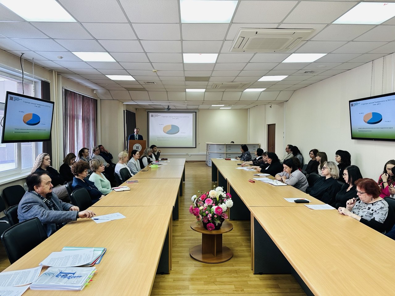 Проректор по экономике Максим Боярский представил подробный отчёт о результатах финансово-хозяйственной деятельности вуза за прошлый год. В целях поддержки молодых педагогических работников СПО в возрасте до 39 лет, не имеющих квалификационной категории, было принято решение ввести ежемесячную выплату в размере 10% оклада с 1 марта по 30 сентября 2026 года.